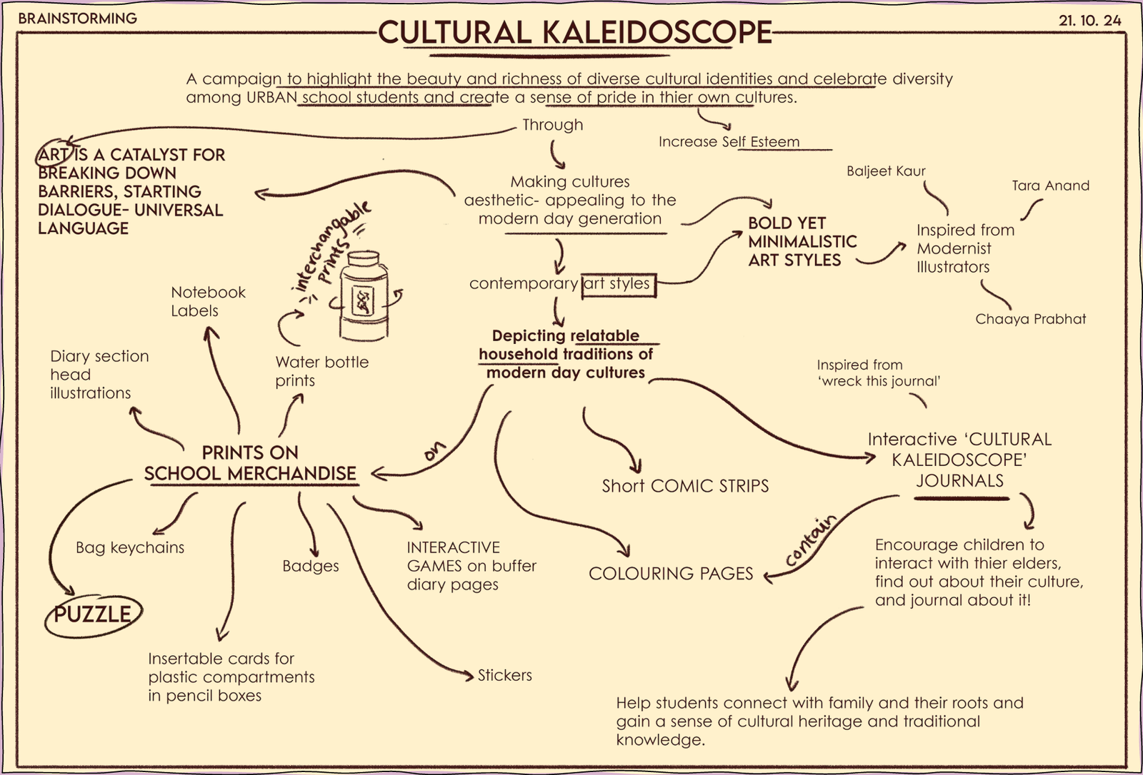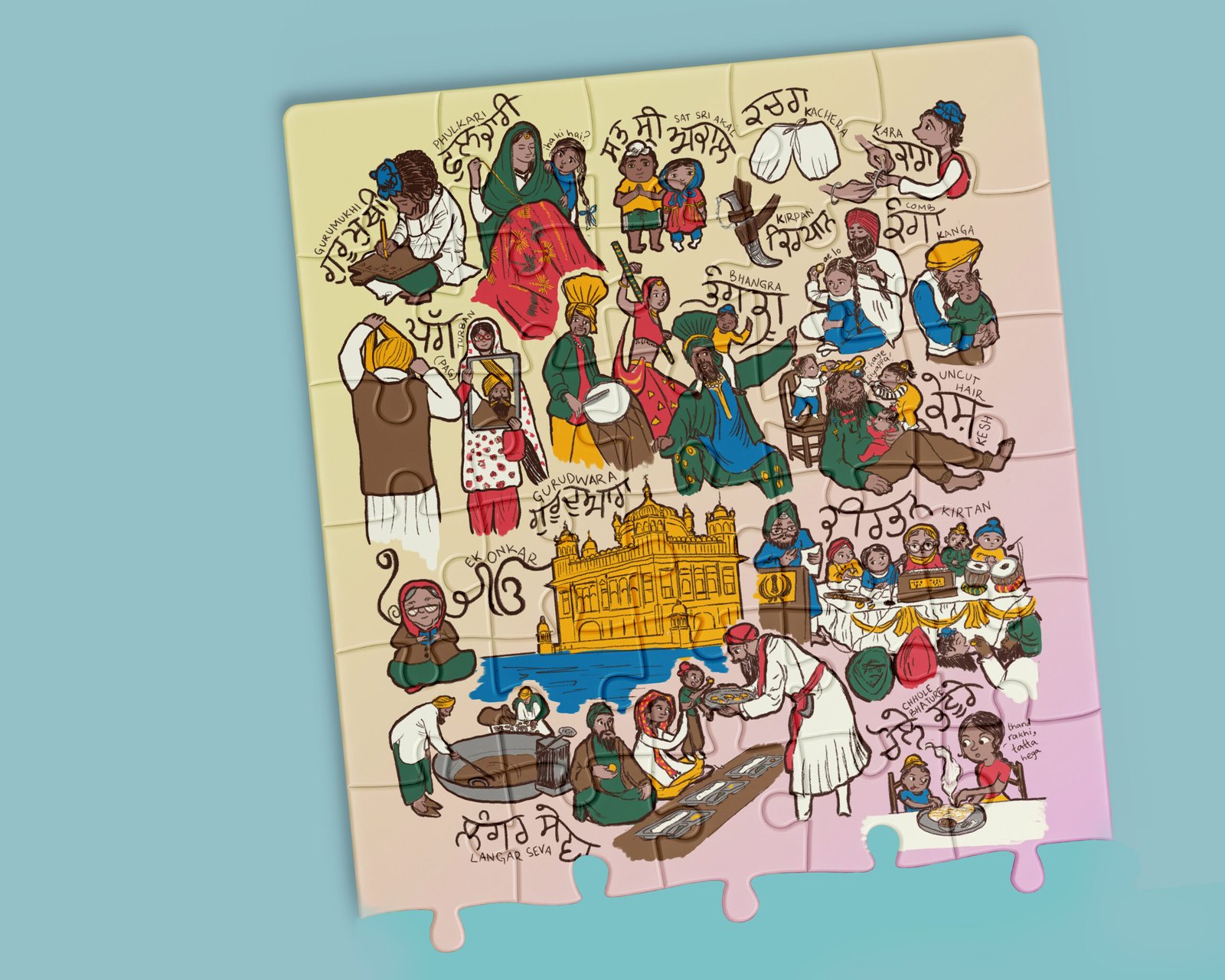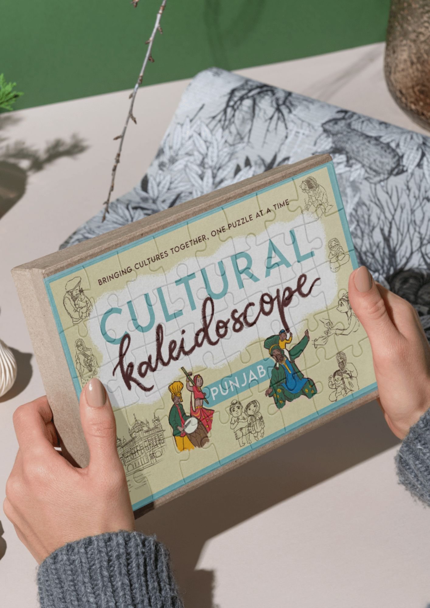 The color palette represents the vibrant colors of Punjab, the mustard yellow symbolizes the mustard fields, the brown is inspired by the wooden dhol drum. There's phulkari pink, peacock blue and