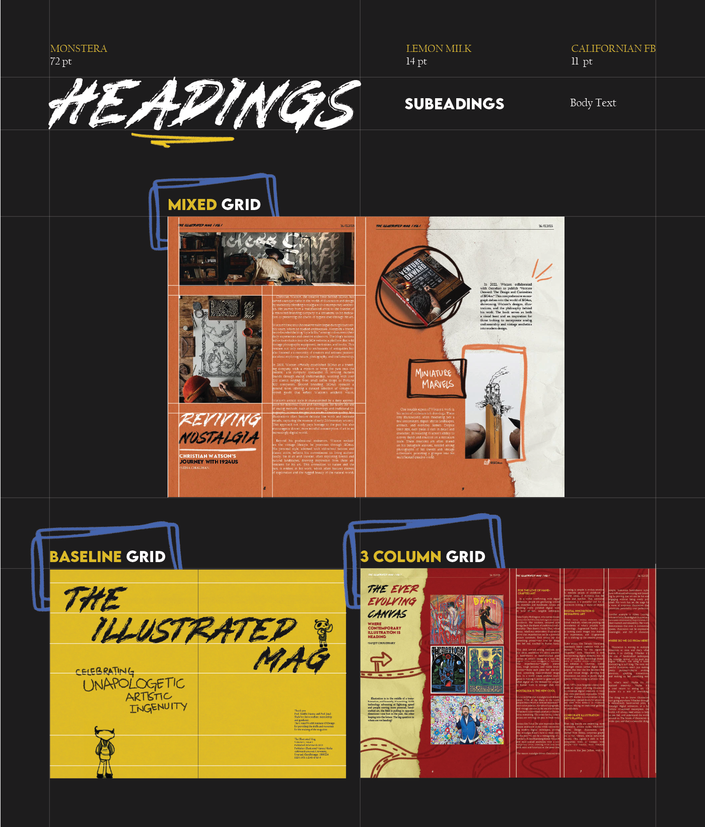 A magazine that captures the unapologetic uniqueness of modern day illustrators, I strived to capture their aesthetic while being true to mine. This magazine features new artists periodically to give them recognition and inspire the artist community. ROUGH. INSPIRED. RAW.